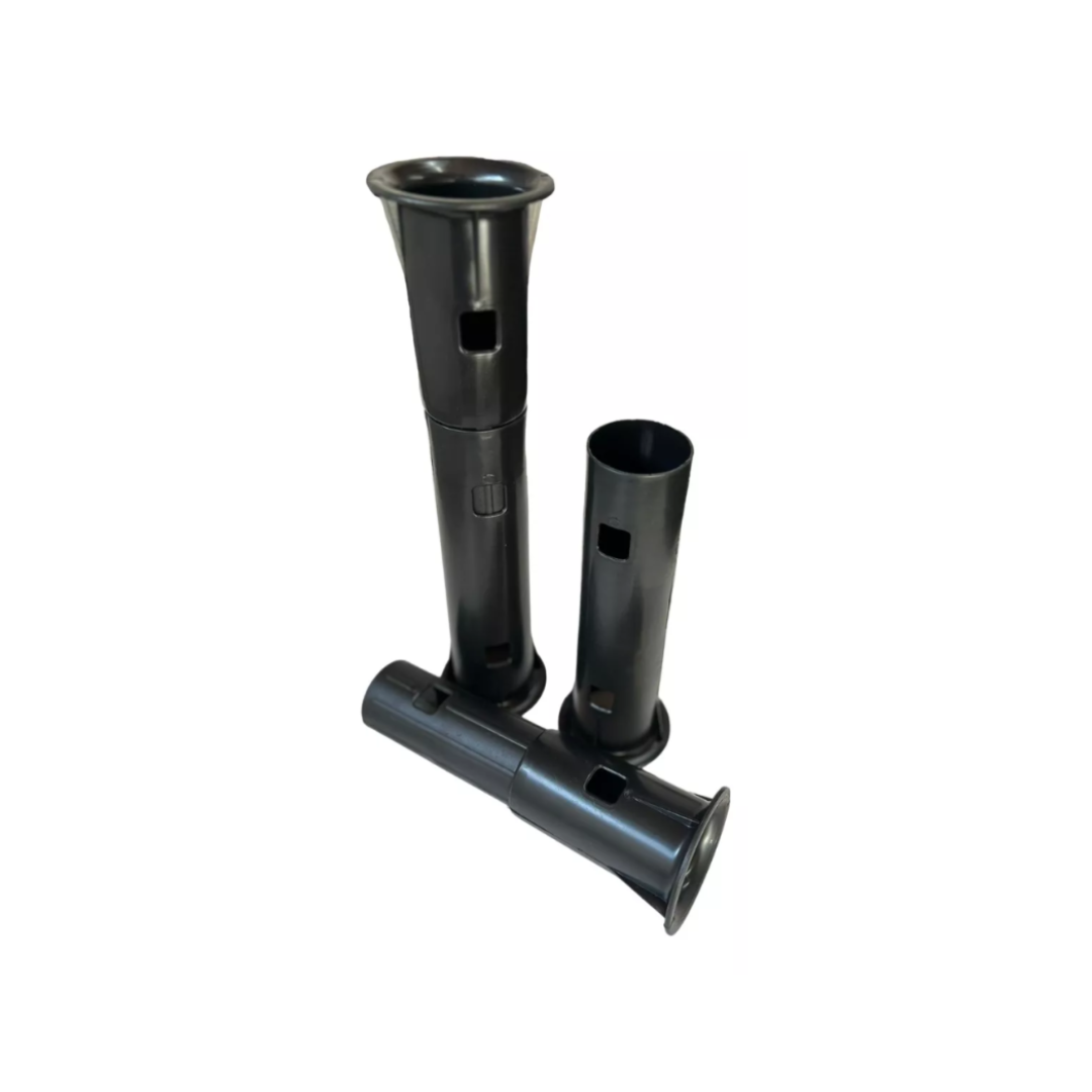 filme stretch, fabricado em plástico resistente na cor preta. O conjunto é composto por dois tubos ergonômicos que se encaixam nas extremidades do rolo de filme, permitindo aplicação mais rápida, uniforme e com menor esforço físico. Possui aberturas laterais para melhor pegada e controle durante o uso, sendo indicado para embalagem, paletização e proteção de cargas em logística, armazéns e indústrias.